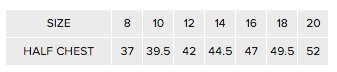 Half Chest (cm) 37 39.5 42 44.5 47 49.5 52